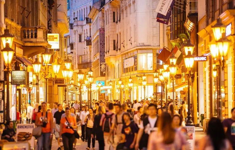 匈牙利布达佩斯一条灯火通明、行人熙攘的步行街。布达佩斯可能是一个有吸引力且费用适中的欧洲会议举办地。图片来源:Alexander Spatari/Getty
