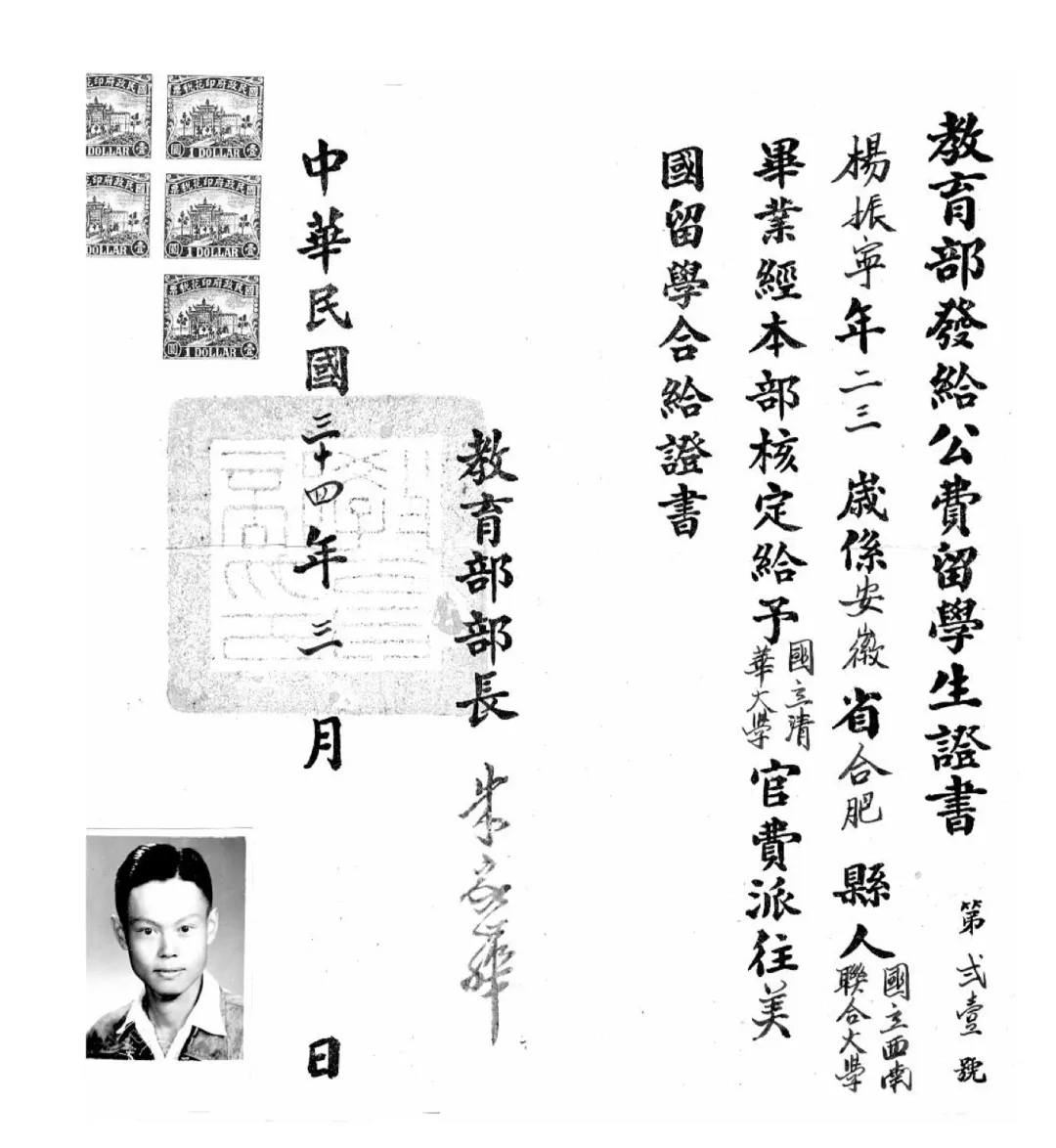 1945年教育部发给杨振宁的公费留学生证书