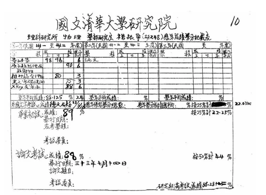 杨振宁在清华大学研究院的成绩表(1942—1944年)