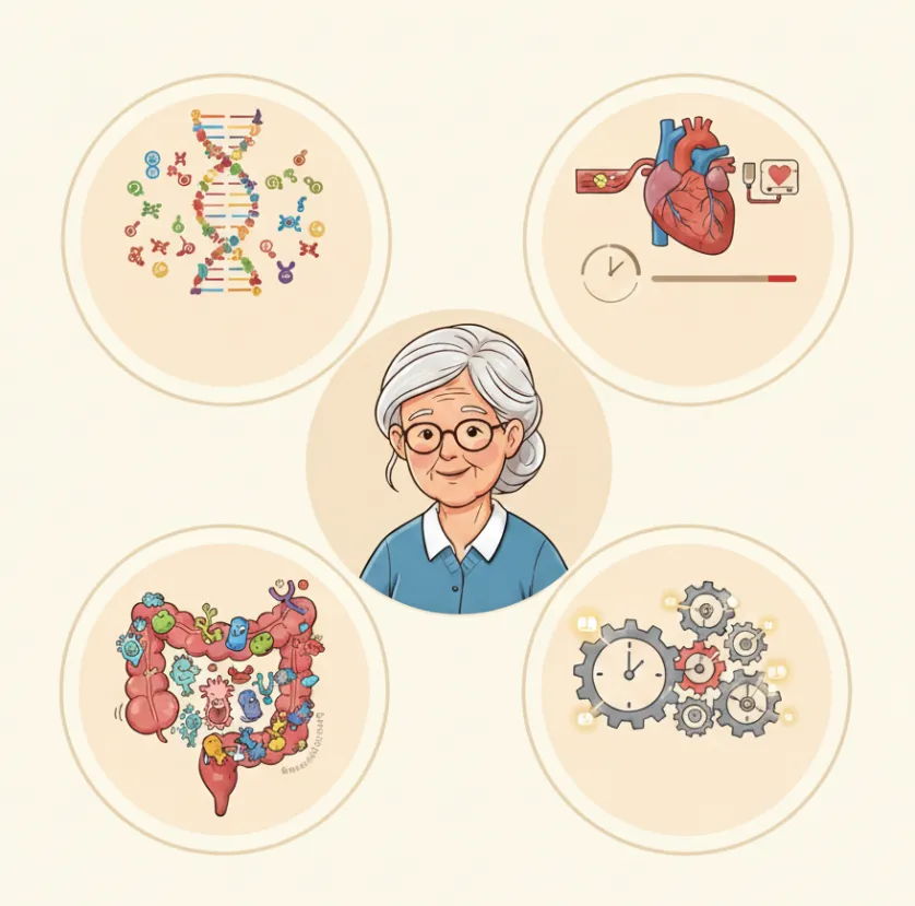 如果说基因是“剧本”,表观遗传的作用就像“导演”,能通过调控基因的开关(比如DNA甲基化),决定哪些基因表达、哪些不表达。科学家发现,百岁老人的表观遗传有两个核心特点:“整体衰老减速”(生物时钟变慢)和“局部精准调控”(关键基因针对性保护),这为他们抵御衰老、避免疾病提供了分子屏障。