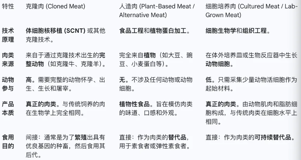 图2:实验室培养细胞培养肉的过程示意图。它与克隆肉存在本质区别,二者在技术原理、来源及最终产品形态上均截然不同,具体差异详见下表。| 图源:参考资料[3]