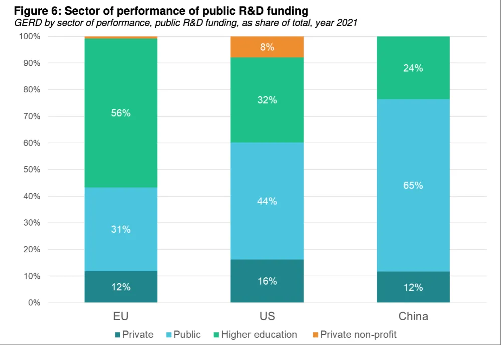 2021年欧盟、美国和中国公共研发资金执行部门分配对比 | 图源:《比较分析》