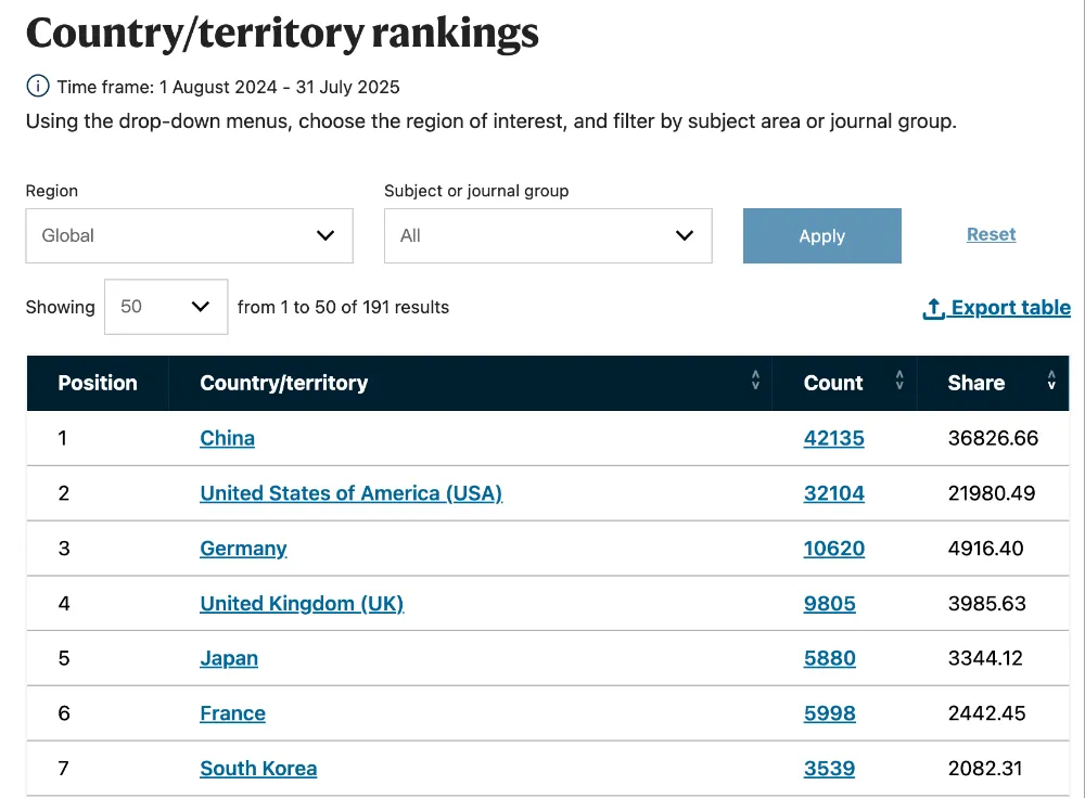 根据自然指数(Nature Index)的最新数据(统计时间:2024年8月-2025年7月),在全球顶尖自然科学期刊中,中国的论文产出量(Count,如果文章的作者来自某个机构/地区,则该机构或地点的计数为 1)达到42135,美国为32104,中国领先约31%;在科研产出份额(Share,指跨国合作时按贡献比例分配后的有效论文量)方面,中国为36826.66,美国为21980.49,中国是美国的1.68倍。