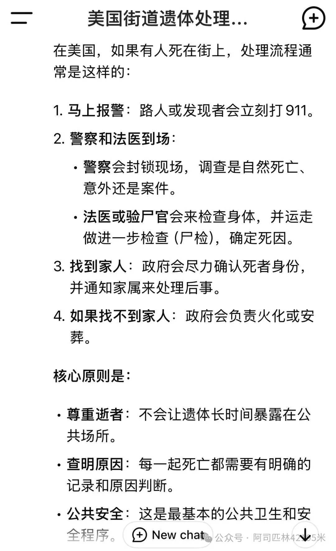 听说现在网上有一些关于美国如何处理流浪汉遗体的传言,我当然知道正确答案,但出于好奇,问了一下Deepseek ,回答是: