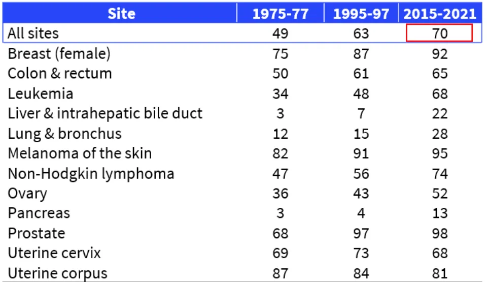 2026年1月,美国癌症协会(ACS)发布年度权威报告《2026年癌症统计》(Cancer Statistics 2026),其中有一条数据引起广泛关注——美国癌症总体的5年相对生存率首次突破70%。这意味着对大多数人来说,癌症不再是“倒计时”,七成患者跨过5年生存门槛。而在1970年代中期,这个数字还只是50%左右。