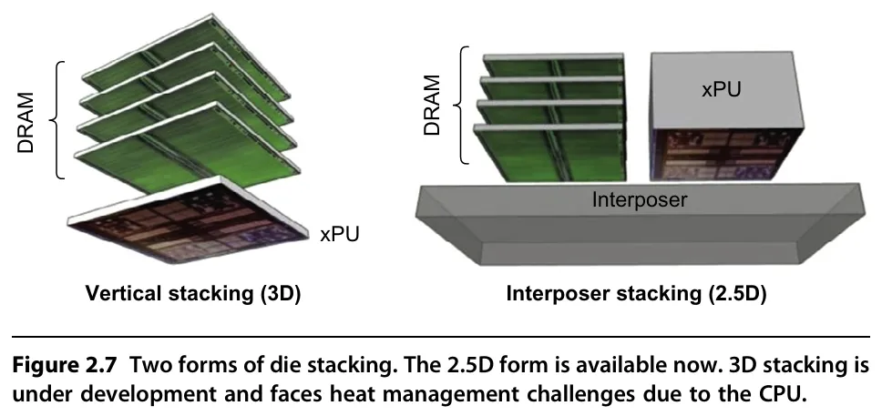 图5 使用3D堆叠技术的HBM内存,图源:Computer Architecture: A Quantitative Approach7th edition