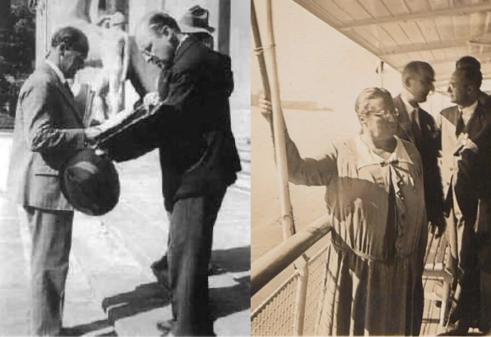 左:路德维希·比伯巴赫与波兰数学家瓦茨瓦夫·谢尔宾斯基(Wacław Sierpiński);右:埃米·诺特与其他参会者在游船上。