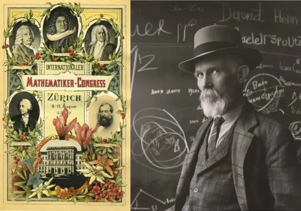 左:第一届国际数学家大会的彩色石版画,上方为五位伟大的瑞士数学家:莱昂·欧拉、丹尼尔·伯努利、雅各布·伯努利、约翰·伯努利和雅各布·施泰纳,下方为曾举办过三届国际数学家大会的瑞士联邦理工学院;右:大卫·希尔伯特。