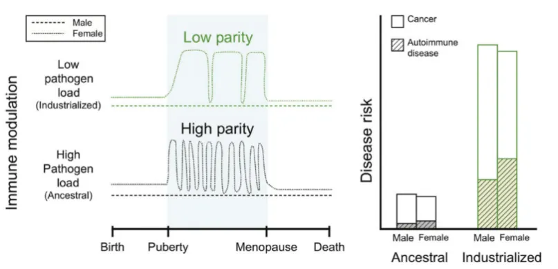 图2 工业社会与古代社会两性间免疫力与疾病风险对比。古代(ancestral)社会中,病原体负荷高(high pathogen load),女性生产次数多(high parity),而工业(industrialized)社会中则相反。低病原体负荷会同时影响男性和女性的免疫功能,导致自身免疫病(autoimmune disease)风险的升高,而低产次只影响女性的免疫系统,加剧自身免疫病在性别间的差异。| 图源:参考文献 [15]